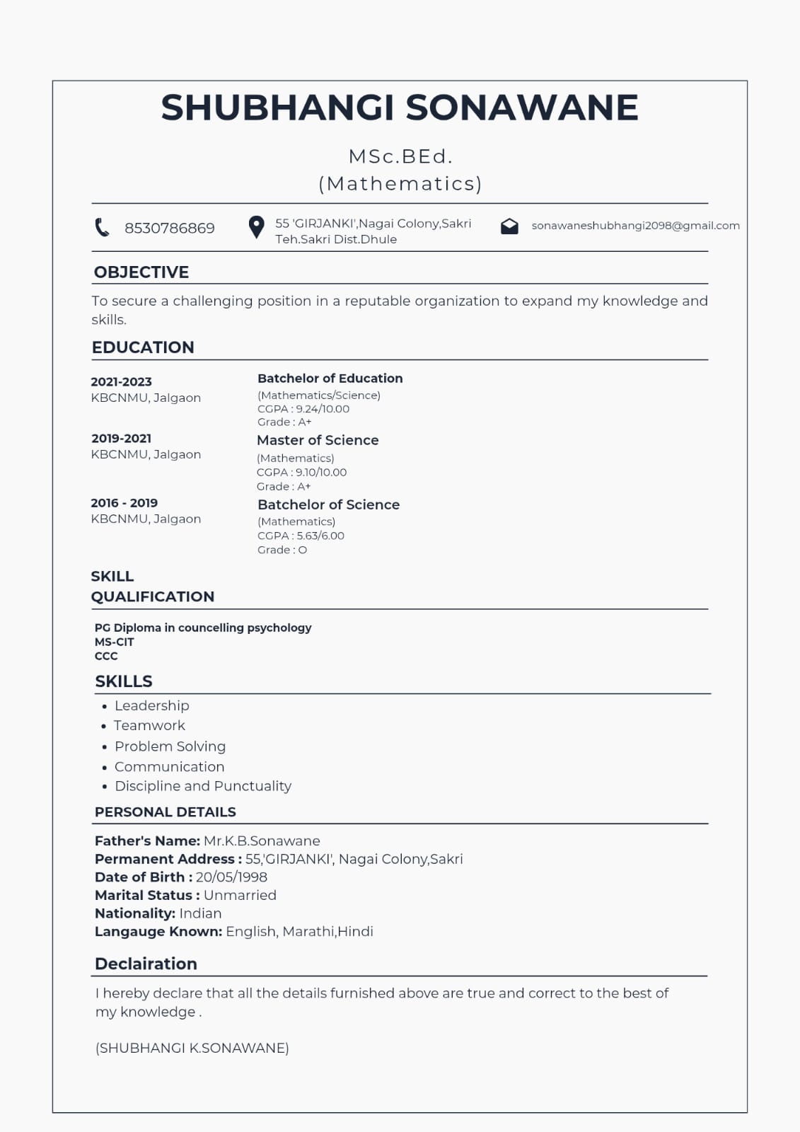 - Email ID: sonawaneshubhangi2098@gmail.com