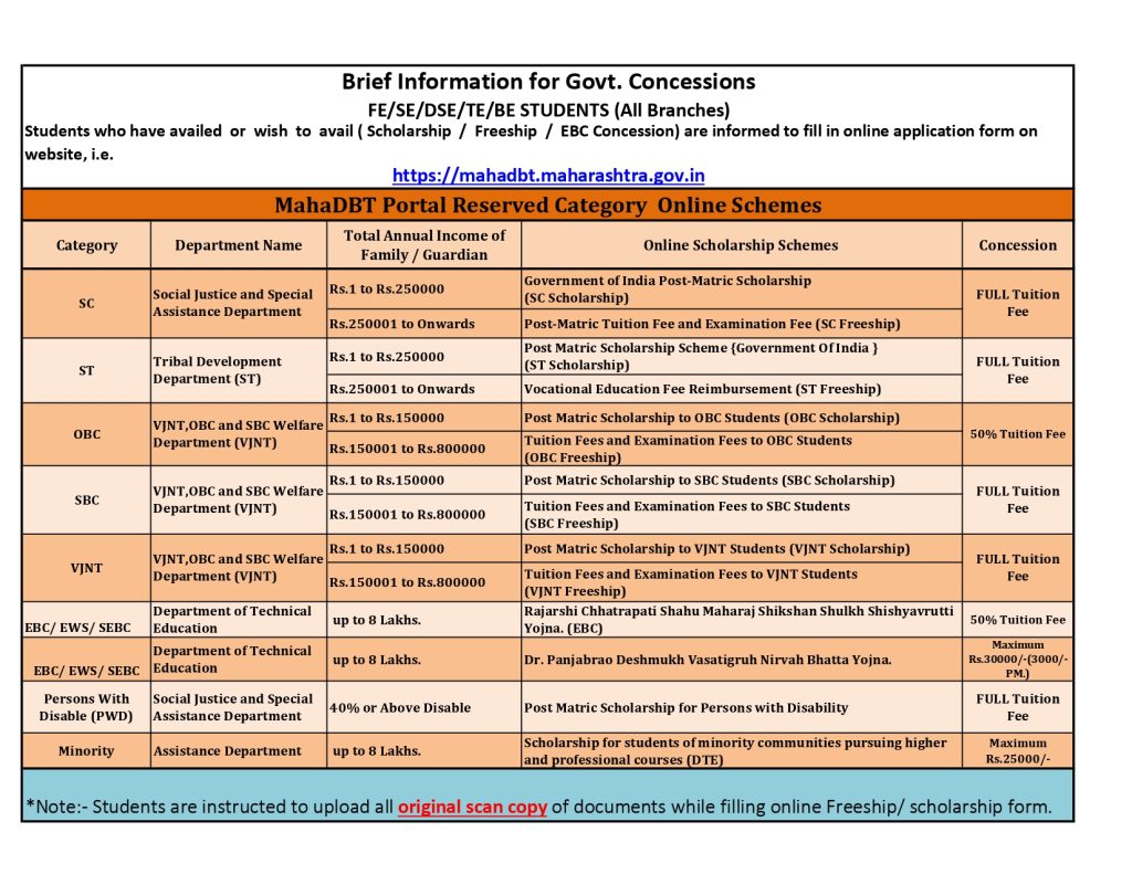 - शासकीय प्रवेश – आपला प्रवेश शासनाच्या केंद्रीभूत प्रवेश प्रक्रियेद्वारे (CAP) मधून झालेला असावा.